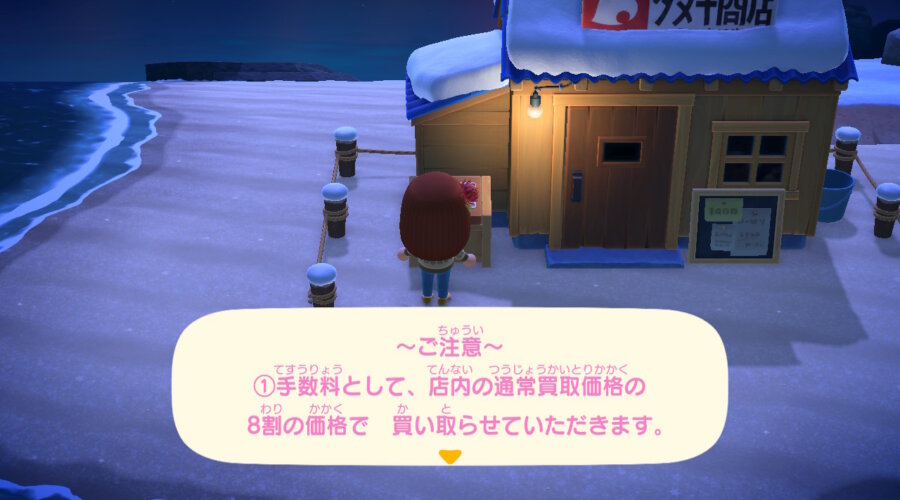 ご注意(ちゅうい):Attention, Warning 手数料(てすうりょう):Commission, Fee として:As 店内(てんない):Inside the shop の:A particle, noun connecter 通常(つうじょう):Normal 買取(かいとり):[noun] Buying 価格(かかく):Price 8割(はちわり):80% で:A particle, “at” At the 80% of the normal purchasing price いただきます:[verb, 謙譲語(けんじょうご) which is one of the Keigo]Dictionary Form:頂く(いただく)[meaning] I receive something (foods, presents, etc.) from someone in higher position. 買い取らせていただきます。:[business language] We will buy it.