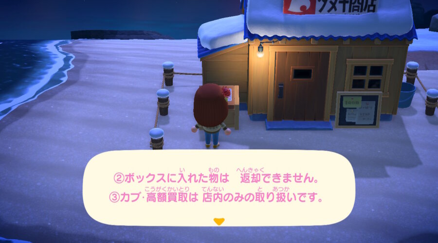 ボックス:Box に:A particle, direction. in this case, “into” 入れた:[verb] past tense of the verb, 入れる, to put things into something 物(もの):thing は、:a particle, subject marker (after the subject) 返却(へんきゃく):[noun] return できません:cannot do カブ:is a name of vegetable, and at the same time, it is a stock. 高額(こうがく):High price 買取(かいとり):purchacing 店内(てんない):Inside the shop のみ:only の:a particle, …